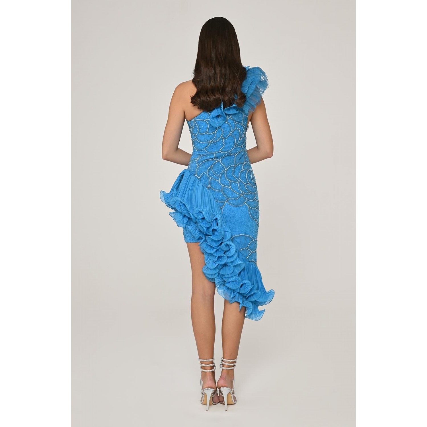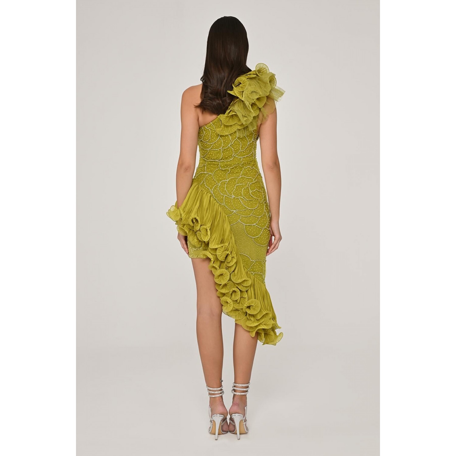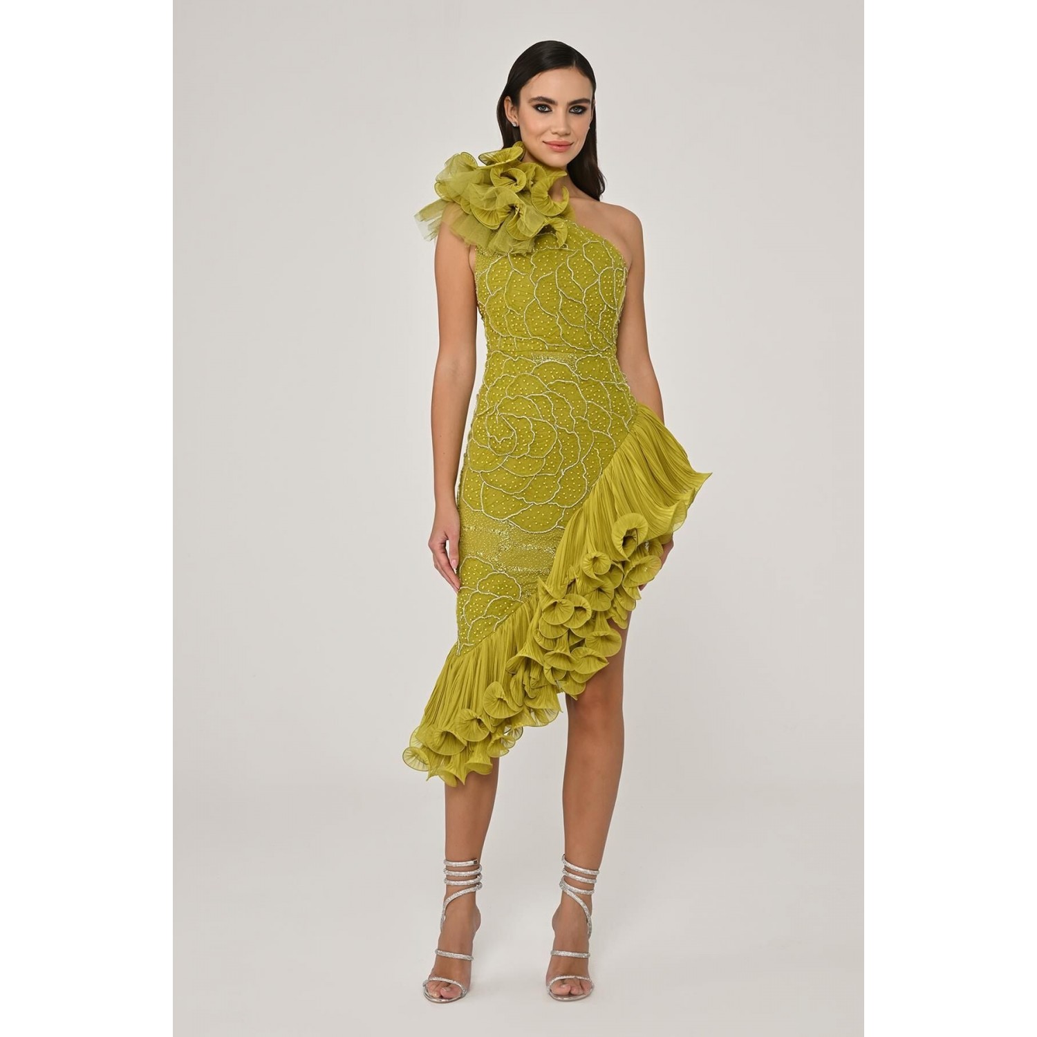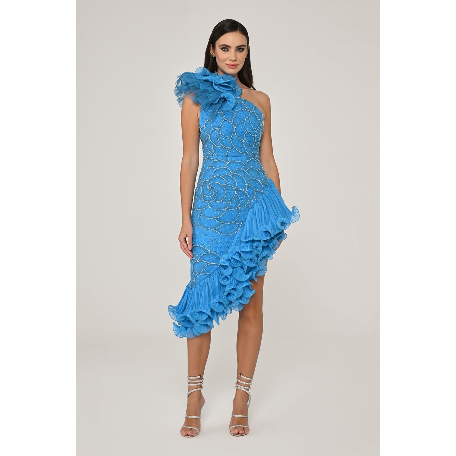 6633,Tek Omu,z Çiçek Aksesuarlı ,Asimetrik Kesim, Şifon Midi Elbise,