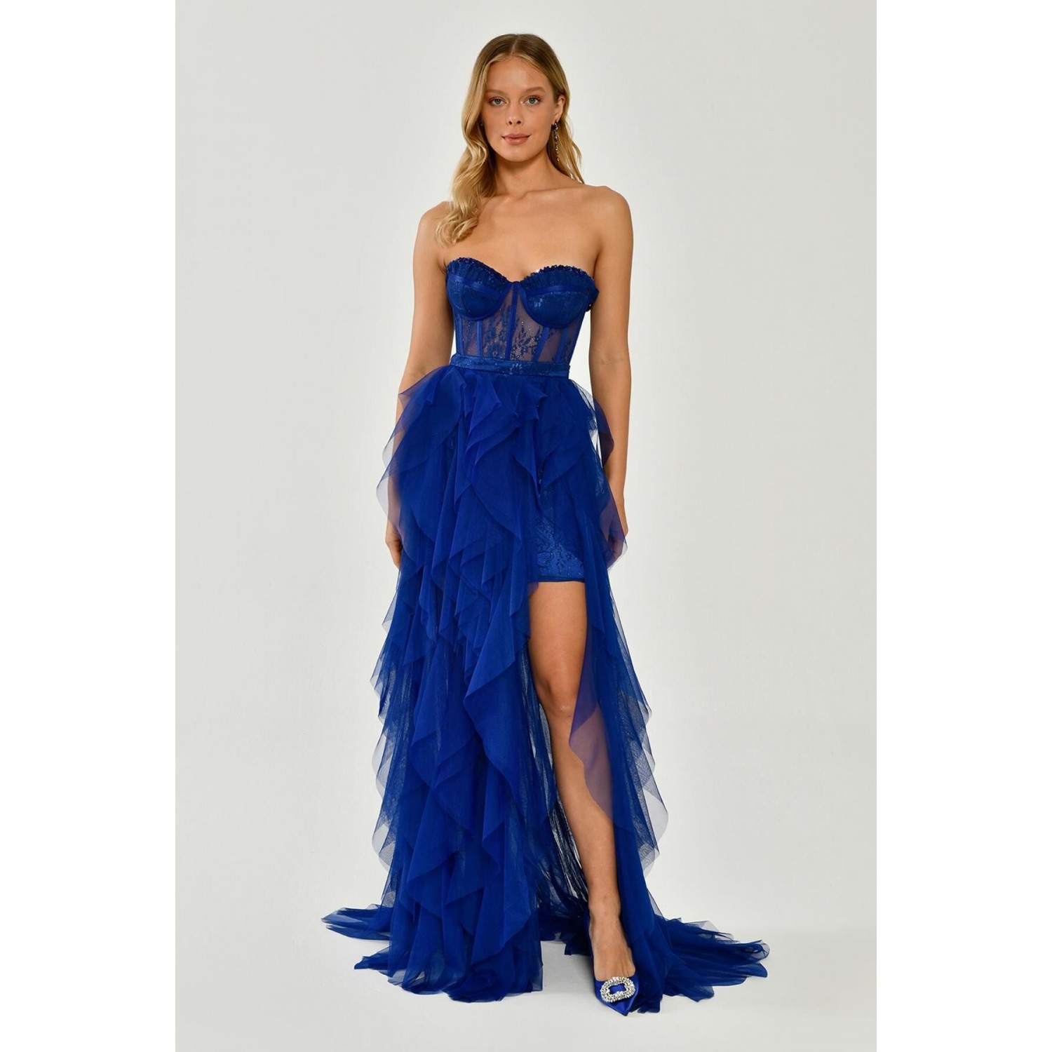 5576 ;Straple,z Yırtmaçlı Katlı, Tül Elbise.