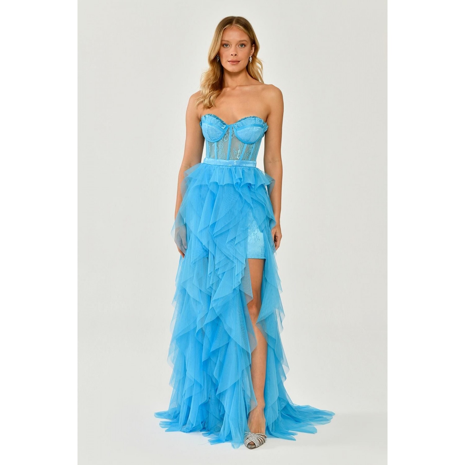 5576 ;Straple,z Yırtmaçlı Katlı, Tül Elbise.
