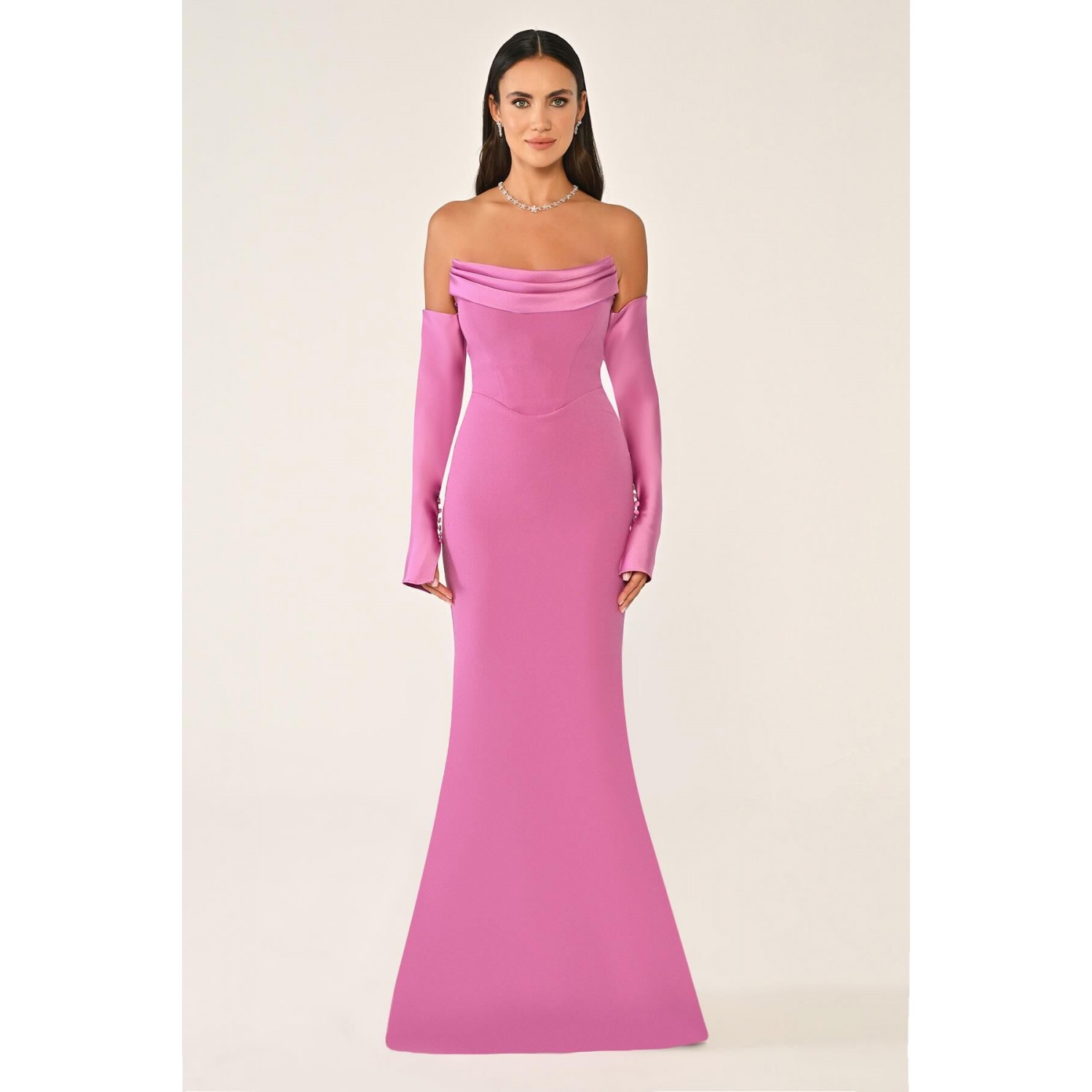 Bu zarif açık pembe abiye elbisesi, omuzları açıkta bırakan tasarımı ve uzun kollarıyla dikkat çekiyor. Vücuda tam oturan bodice kısmı, nazikçe bel hatlarınızı vurgularken, etek kısmı hafifçe genişleyerek zemine kadar uzanıyor ve sofistike bir denizkızı silueti oluşturuyor. İnce detaylar ve modern kesimiyle bu elbise, gece davetlerinde zarif ve şık bir görünüm sunuyor.